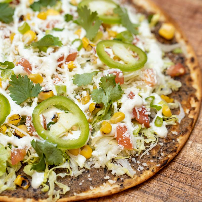 Flavors from the Tex/Mex border - Black bean & corn blend spread on thin lavash bread, topped with shredded lettuce, roasted corn, tomatoes, jalapeños, scallions, cilantro, cotija & jack cheeses and drizzled with lime crema dressing. Available vegan and/or gluten-free. Plant-based meat alternatives are also available.