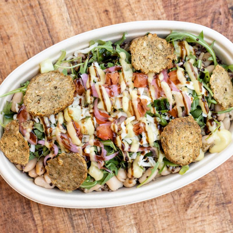 Inspired by Greek cuisine - Protein-rich gluten-free grains & white beans blended with curated seasonings, topped with plant-based chick'n, arugula, cucumber, tomato, pickled red onion, kalamata olives & crumbled feta cheese and finished with our signature tzatziki dressing. Take off the cheese and swap out the dressing to make it vegan.